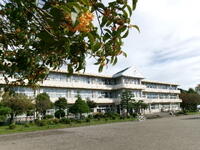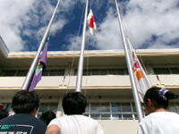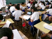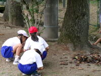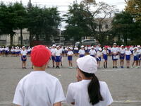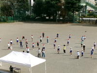 昼休み、校庭で応援団が練習します。ほかの人たちは校舎内外で昼休みです。