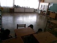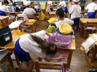 子供たちは机をバリケードのように集め、その下に隠れます。