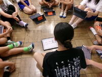 5年体育、高学年の表現(ダンス)が決まり、動画を手本に練習が始まりました。