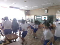 低学年の体育、表現(ダンス)。ステージのお手本の人を見ながらだいぶ覚えてきました。