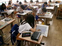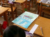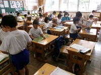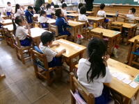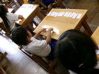 1年国語、「ついたち」「ふつか」などひにちの言い方の学習。漢字で書いてあるカードから先生の言ったひにちを選びます。