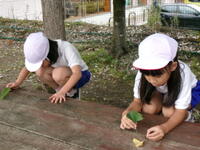 1年国語、落ち葉や枝などを組み合わせて、何に見えるかをクイズにします。