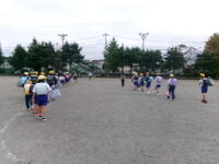 1・2年体育、表現(ダンス)。校庭で隊形移動を練習します。