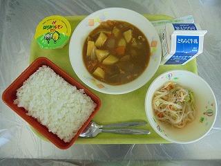 今日は1年1組のリクエスト献立です。カレーに含まれている辛み成分のカプサイシンには、体温を上げて汗を出す作用や、反対に気温が高いと体温を下げる働きがあります。また、辛みは食欲を出す働きもあります。もりもり食べましょう。