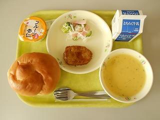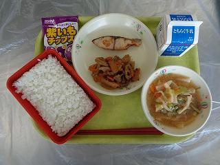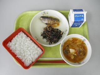 今日は「給食の始まり献立」です。明治22年に山形県の忠愛小学校で出された食事が、日本で最初の給食といわれています。お弁当を持ってこられない子ども達のために、昼食を用意したのが始まりです。当時の献立は「おにぎり、焼き魚、漬け物」でした。今日はそのときの献立にちなんで「おにぎり給食」になっています。