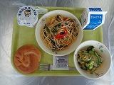 米粉パン*とちおとめジャム*牛乳*にらとひき肉の辛味スパゲティ*グリーンサラダ*栃木県民デザート