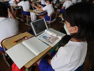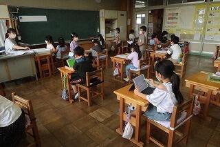 今日は雨だったので、児童全員が体育館に集まることはできません。応援団だけが体育館に集まって、運動会全体練習をリモートで行いました。各教室では、紅白の応援団長さんの指示に従って拍手やあいさつの練習をしました。タブレットの活用によって先生方のアイデアと準備で運動会の練習の仕方も様々な形態が生まれてきています。