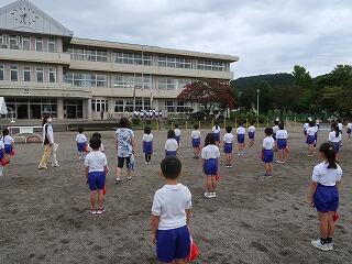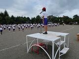 今日は、ブラスバンド部の生演奏に合わせて運動会開会式の練習を行いました。本校のブラスバンド部は人数が少ないのですが、夏休み中も練習を重ね、国旗掲揚の「君が代」や優勝旗返還の「見よ、勇者は帰る」の演奏ができるようになりました。特に今年度入部した児童の皆さんよく頑張りました。