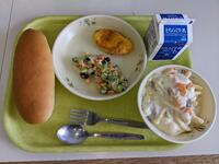 今日の給食は、きれいな彩りのメニューでした。マカロニのクリーム煮は、野菜もたっぷりでした。