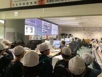 消防署の内外を見学させてもらいました。災害対策室ではたくさんのモニターや電話を受け取る人たちがいました。