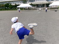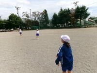 3年体育、ソフトボール。キャッチボールを楽しみながら投げる捕るの動きに慣れていきます。
