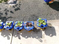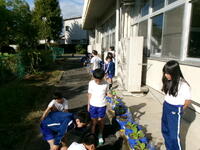 2年生は、白菜の苗に水やりをします。
