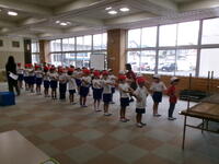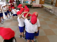 1年学活、運動会に向けて組分けや紅白の並び方を確かめています。