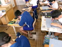 6年図工、版画。版木の下絵に合わせて彫り始めました。