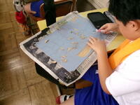 2年算数、三角と四角形を組み合わせていろいろなものの形をつくります。