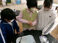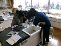 5年理科、ものの溶け方を考える実験。ミョウバンを水に溶けるまでよく混ぜます。