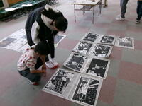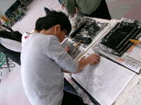 6年図工、出来上がりを確かめながら彫り直し、また刷ります。