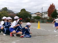 2年体育、ベースボール型ゲーム。ボールをけったあと、守るチームがボールを押さえて列になりしゃがみます。