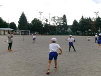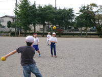 6年体育「ソフトボール」、チームごとにトスバッティングなどをして、試合前の練習をします。