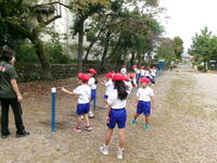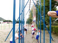 1年体育、てつぼうあそびとのぼりぼうあそび、高くまでのぼる人、逆上がりをする人、何度も挑戦する人、楽しく遊びながら運動能力を身に付けます。