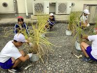 5年生の総合的な学習の時間では、お米について調べています。そこで「バケツ稲」で実際にお米を育て、その成長を観察しました。