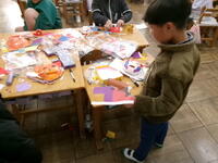 2年図工、お面づくり。楽しいかざりを工夫してお面が出来上がります。