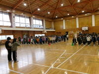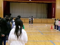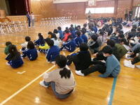 業間、体育館で在校生の全体練習。5年生のリーダーがめあてや振り返りを進行します。