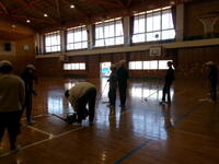 6年家庭、お世話になった学校をきれいにするため、体育館の床にコート剤を塗ります。