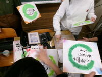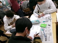 6年図工、筆ペンを使って文字や絵を自由に描く「己書(おのれしょ)」。卒業を見据えて、家族などへの感謝を表します。
