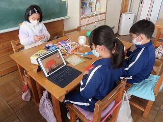みんなでお楽しみ会の会場準備や飾り付け、出し物の準備を行いました。作り方が分からないときは、タブレットで映像を確かめます。