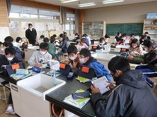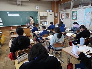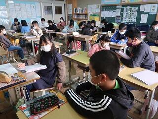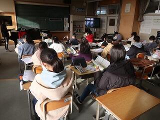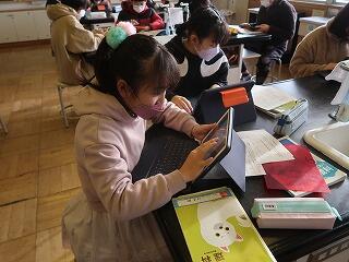 卒業式の歌の練習に入りました。パートをソプラノとアルトに分けてそれぞれ別の教室で練習しています。タブレットを使ってコンクールで上位に入賞した映像を見ながらイメージも膨らませています。