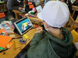 グループに分かれて「おもちゃランド」の準備に取り組んでいます。分からないときはタブレットの動画や図で確認しました。