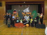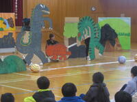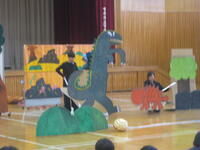 お話が終わった後の出演者の紹介の場面では、校長先生がふんした「ティラノサウルス」が登場し、大盛り上がり!!