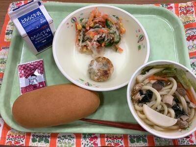 コッペパン マーシャルビンズ 牛乳 にらまんじゅう 大根とツナのサラダ おかめうどん