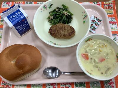 セルフハンバーガー(ミルクパン・ハンバーグ・ケチャップ) 牛乳 ほうれん草 ソテー コーンシチュー