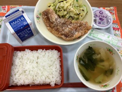 ごはん 牛乳 HIMITSU豚のたつたあげ キャベツの塩こんぶ和え ゆばのすまし汁 水ようかん