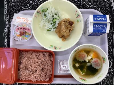 ごはん 牛乳 とりのからあげ韓国風 ナムル 豆腐とわかめのスープ