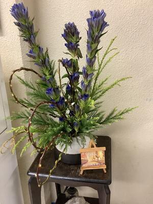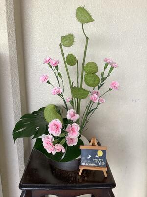 今月の花は、リアトリス、菊、スプレーカーネーション、アレカヤシです。リアトリスは、花茎にびっしりと花を咲かせるきれいな草花です。暑い中で、きれいな花を咲かせています。