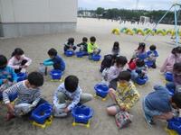 仲間作りゲームとして、ブルーシートの端を持って、真ん中のバケツにボールを入れるゲームをしました。とても難しい~!みんなで声をかけあってやりました。