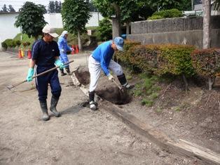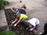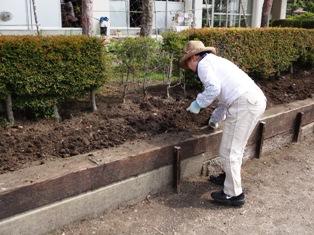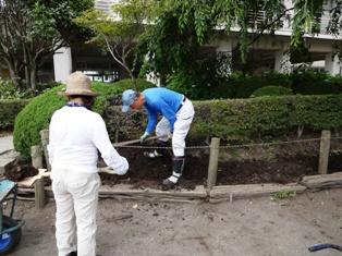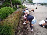 今日のロング昼休みに、ボランティアの皆様にお世話になり、パンジーの苗植えをしました。時々小雨の降る中でしたが、環境委員会の児童と一緒に作業をしていただきました。肥料もボランティアの方が前日に運んでくださいました。その肥料を入れ、平らにして、色を考えて配置し、スコップで穴を掘って植え、手でしっかり押さえました。手順を教えていただき、スムーズに作業を進めることができました。