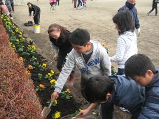 今日の昼休みに、ボランティアのお二人の方にご指導いただき、環境委員会の児童が花の苗を植えました。ボランティアの皆様には、19日に花壇を整備する時にもお手伝いをいただき、今日も引き続きお世話になりました。マリーゴールド・サルビア・百日草・千日紅の4種類の苗で、校庭を囲うように植えました。昼休みだけでは終わらなかったので、その後もボランティアの皆様と学校の職員とで植えました。校庭が花で囲まれる日が来るのが楽しみです。