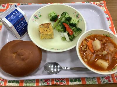 はちみつパン 牛乳 スペイン風オムレツ イタリアンサラダ ポークビーンズ