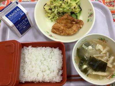 ごはん 牛乳 とりのからあげレモンソース キャベツの塩こんぶ和え みそ汁