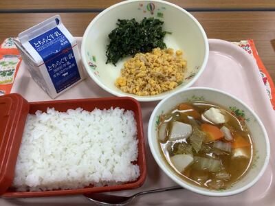 三色丼 (そぼろ・ごま和え) 牛乳 けんちん汁