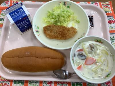 セルフフィッシュバーガー(コッペパン・白身魚 フライ・ボイルキャベツ・ソース) 牛乳 マカロニのクリーム煮