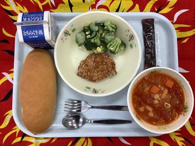 コッペパン チョコパテ 牛乳 ささみカツ ブロッコリーサラダ ミネストローネスープ
