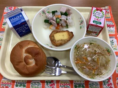 米粉パン 牛乳 チキンのチーズ焼き カリコリサラダ オニオンスープ セレクトデザート