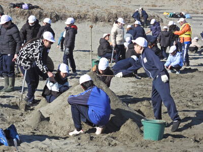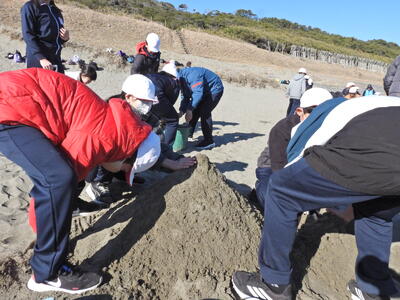 2日目午前は砂浜活動を行いました。手や足を砂だらけにしながら、友達と協力して様々な形を作り上げていました。