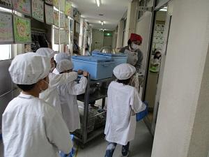 1年生は給食当番の仕事がとても上手になりました。整列して給食室までワゴンを取りに行き、みんなで協力して配膳します。グループごとに、楽しく話しながら食べています。苦手なものにも挑戦して食べられるようになったり、食べる量も増えたりしてきています。栄養のバランスを考えてながら、毎日おいしくいただいています。