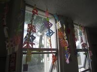 図工で「ちょきちょき かざり」をやりました。紙を折ったり、重ねたりして切るとできる形を楽しみました。はさみの使い方も上手になり、細かく切ることができました。風に揺れる様子はとってもきれいです!
